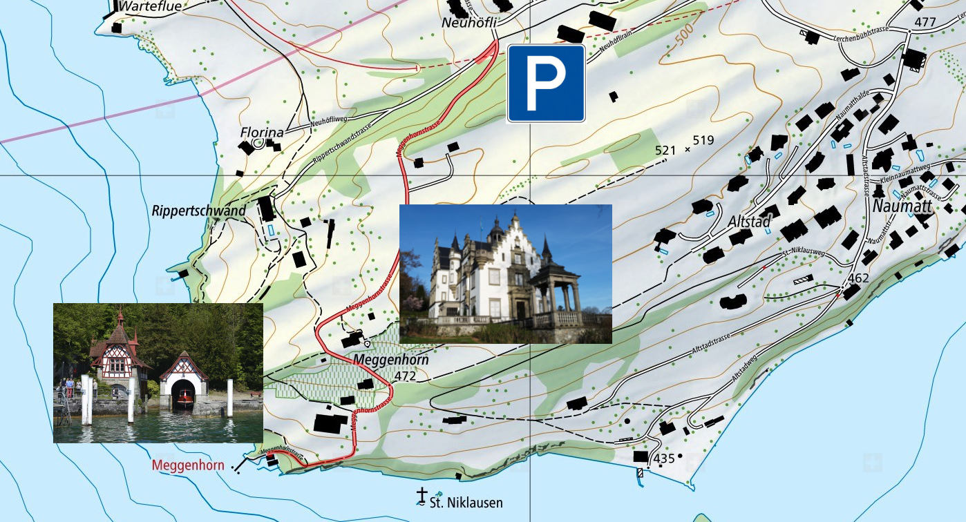 Ab Luzern via Verkehrshaus/Hermitage nach Meggen oder ab Autobahn Zug-Küssnacht via Merlischachen nach Meggen bis Restaurant Lerche und zum Schloss Meggenhorn. Der Weg zum Schloss ist ab der Lerchenbühlstrasse sehr gut ausgeschildert. Navi Koordinaten 47.038967, 8.358506
